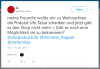- Florentin und Stefan empfehlen schüchternen Fans, die Shirts in der Farbe weiß zu bestellen, da so das (weiße) Logo nicht sichtbar ist, man also unbehelligt im DAS PODCAST UFO-Merch herumlaufen kann