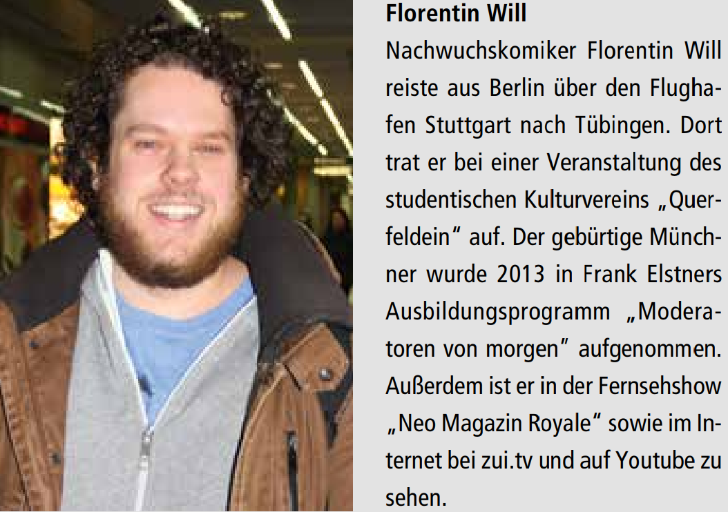 Beschreibung?: Nachwuchskomiker Florentin Will reiste aus Berlin über den Flughafen Stuttgart nach Tübingen.