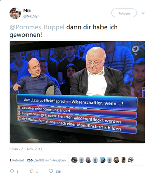 In Folge UFO118 Sole präsentiert Florentin den Lazarus-Effekt als Effekt der Woche und fragt Stefan danach ab. Dieser überspielt sein Unwissen mit einer humoristischen Anspielung auf den Ikarus-Mythos: "wenn du zu nah an die Sonne fliegst, du merkst, je näher du kommst, dass du keine Ahnung hast, wer Lazarus eigentlich ist." Florentin startet daraufhin ein "interaktives Quiz", das die unbedarfte Community zum miträtseln einladen soll: